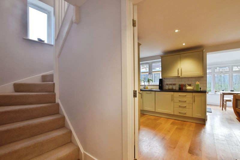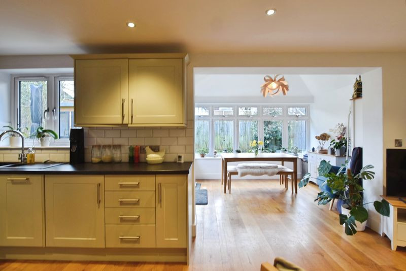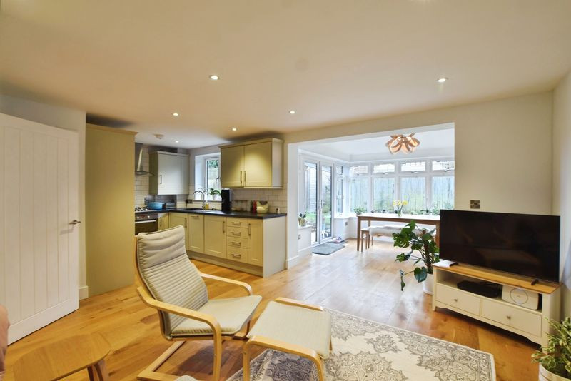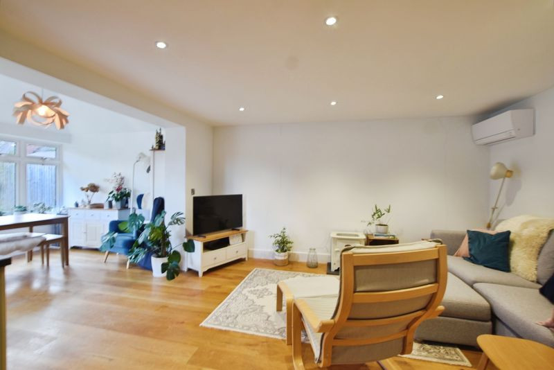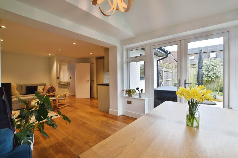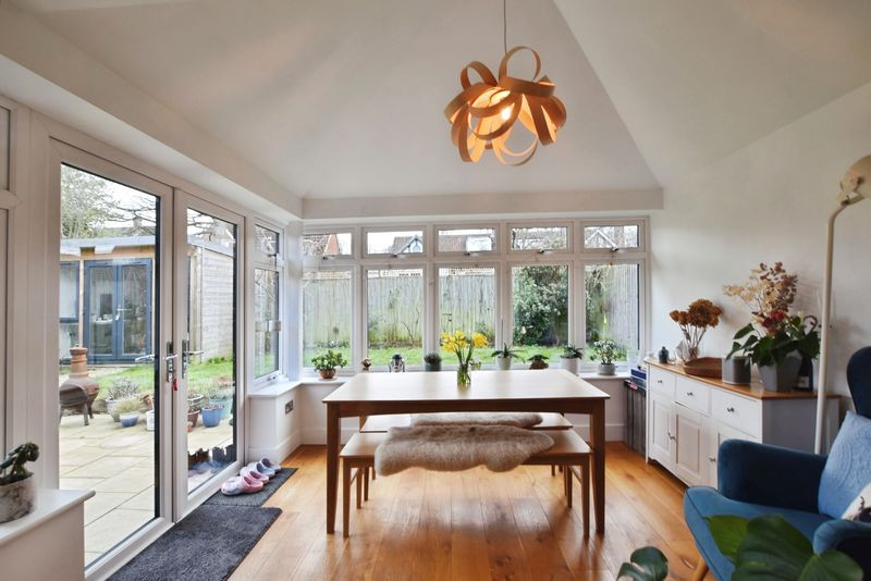 The dining area enjoys a vaulted ceiling with extensive glazing, creating a light-filled space that opens directly onto the south-facing garden. Also on the ground floor is a flexible study or second bedroom, along with a cloakroom, for which there is existing planning permission to convert into an additional shower room if desired.
