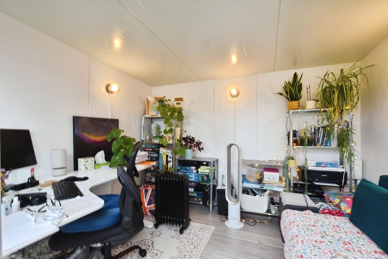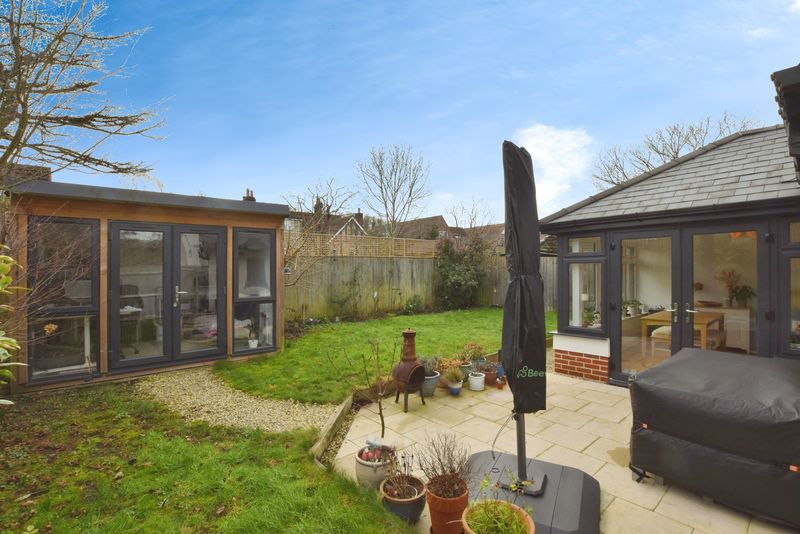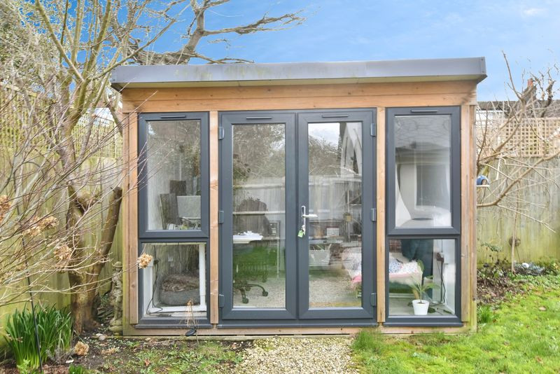 To the rear, the south-facing gardens are a particular highlight, offering a high degree of privacy and enjoying sunshine throughout the day. The gardens are attractively arranged with a patio area, lawn and an office pod, ideal for home working or additional leisure space.