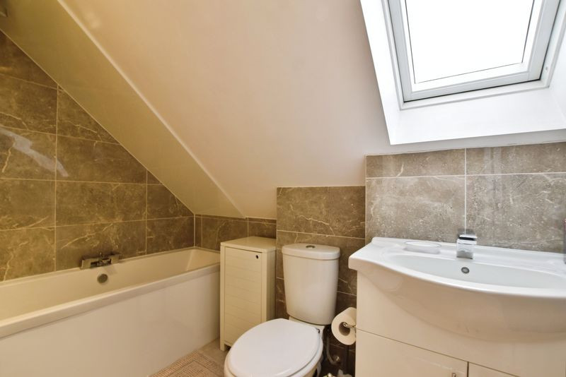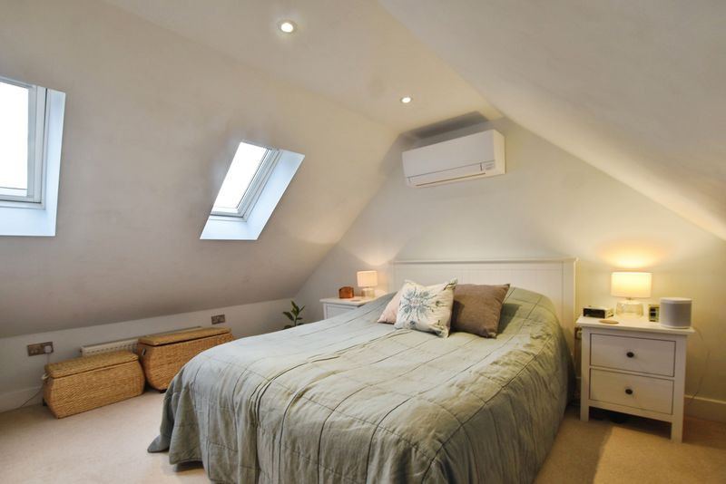 The first floor is dedicated to a beautifully appointed principal bedroom, featuring sloping vaulted ceilings that add character and a stylish en-suite bathroom with shower over bath. The property benefits from gas-fired central heating, air conditioning, and powder-coated PVCu windows, ensuring year-round comfort and efficiency.