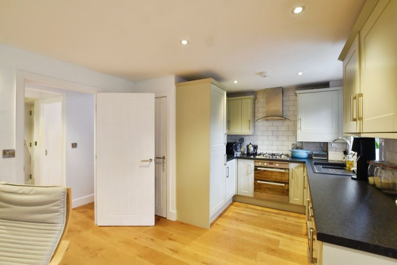 The ground floor is centred around an impressive open-plan kitchen, dining and living space, designed for both everyday living and entertaining. The kitchen is comprehensively fitted with a range of high-quality units and integral appliances, including a dishwasher, washer/dryer, electric hob with extractor and oven, all set beneath granite work surfaces. Engineered oak flooring, inset LED lighting and underfloor heating enhance the sense of quality and comfort.