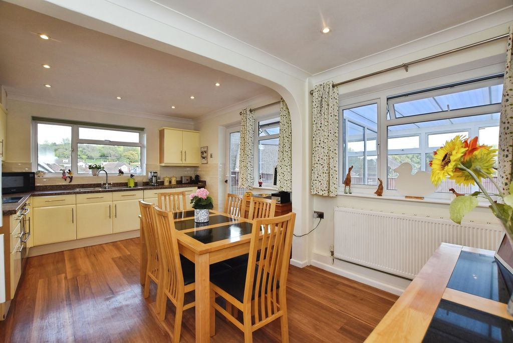 The rear of the property provides particularly appealing living space. The kitchen/dining room is both spacious and well designed, forming the heart of the home and offering ample room for both cooking and dining. Fitted with a range of neutral cabinetry and work surfaces, the kitchen incorporates integrated appliances including a double oven, hob and washer/dryer, alongside space for a full-height fridge freezer. The room benefits from excellent natural light and direct access to the adjoining conservatory areas.