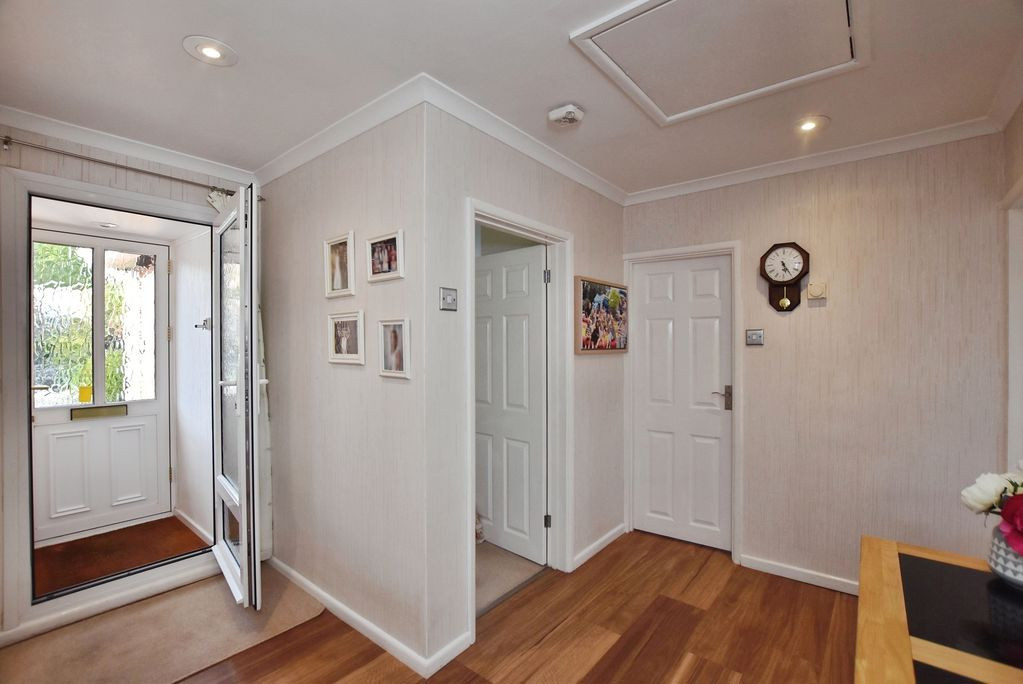 The property is approached via a neatly landscaped frontage, combining an area of lawn with decorative stone, creating an attractive first impression. A driveway provides off-street parking and leads to the garage, while a porch and secondary entrance door open into a central hallway, from which all principal accommodation is arranged.