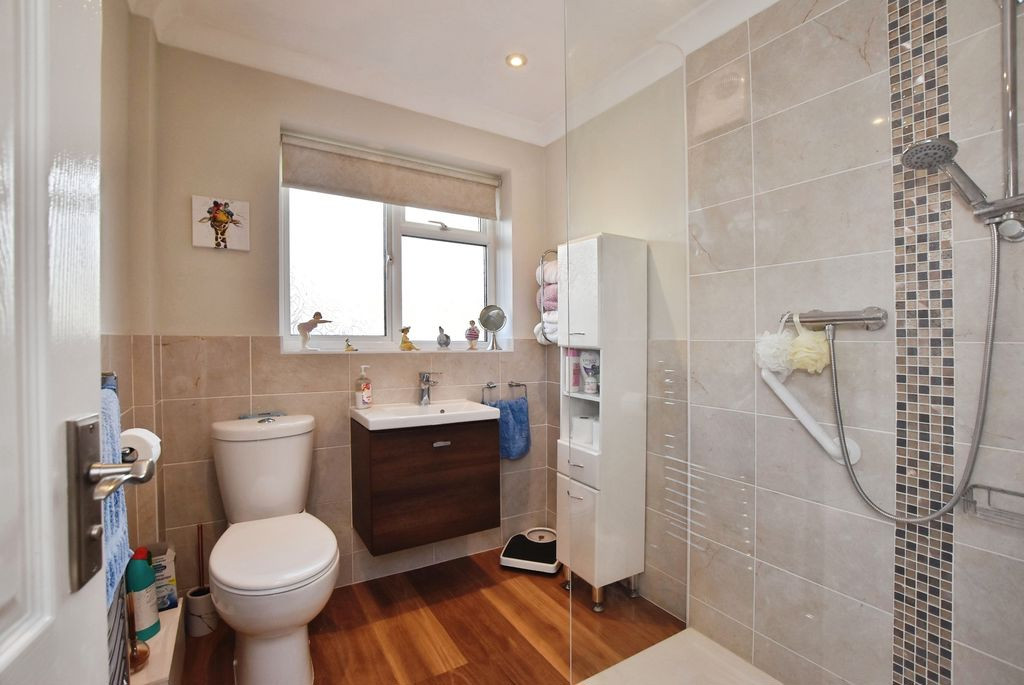 To the front of the property are two generous double bedrooms, both enjoying a pleasant outlook and excellent natural light. The principal bedroom is particularly well-proportioned and benefits from a range of fitted wardrobes, while the second bedroom also offers built-in storage, making both rooms highly practical. These are served by a stylishly appointed shower room, fitted with a contemporary walk-in shower, WC and a wall-mounted basin with integrated storage, complemented by a side aspect window.