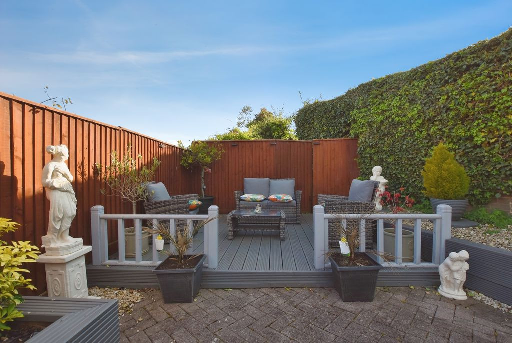 Externally, the rear garden has been thoughtfully landscaped to create a low maintenance yet highly attractive outdoor environment. Predominantly laid to patio, with raised beds providing structure and seasonal interest, the garden also features a decked seating area to the rear. The south-facing orientation ensures excellent sunlight throughout the day, while established planting offers a good degree of privacy.