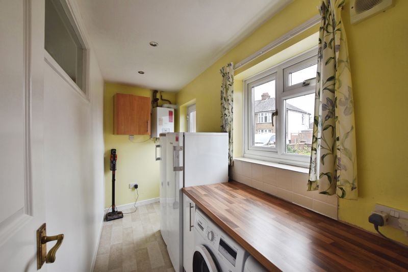 On entering, the hallway gives access to the principal reception rooms. To the left, the kitchen is a well-proportioned and functional space, fitted with a range of wall and base units, ample work surfaces, and a large front aspect window which floods the room with natural light. Adjoining is a sizeable utility room with further storage, space for additional appliances, and a secondary entrance.