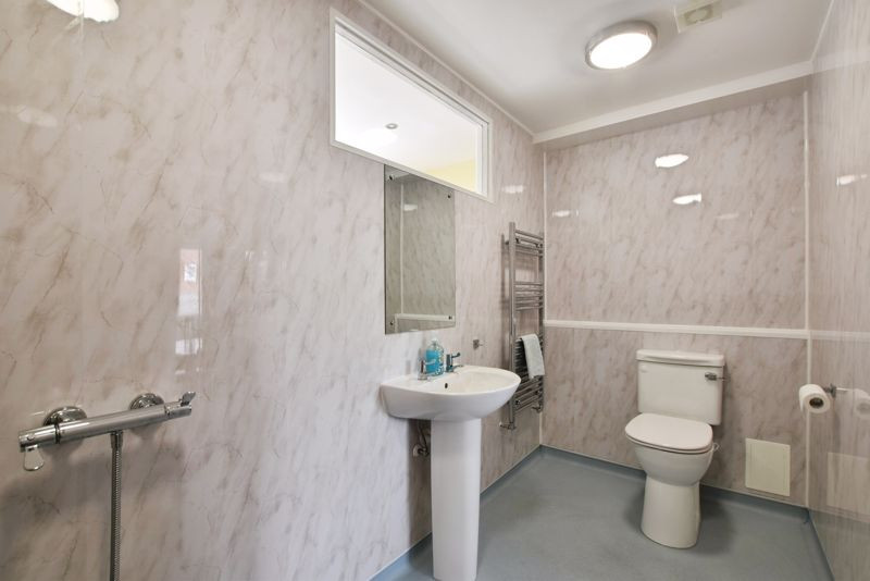 To the rear, the sitting room is an inviting space with a wood-burning stove recessed into the chimney breast, creating a warm focal point. An archway links through to the dining room, which benefits from direct access to the rear garden, offering an excellent flow between indoor and outdoor living. A contemporary ground-floor wet room, finished with full-height wall panels, completes the level.