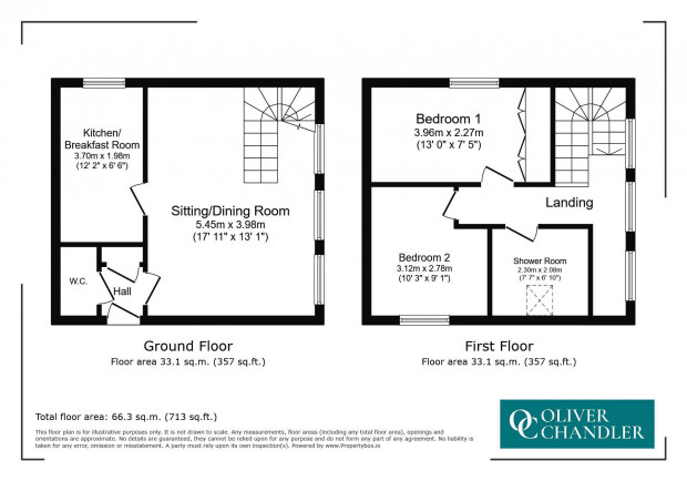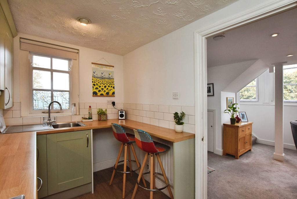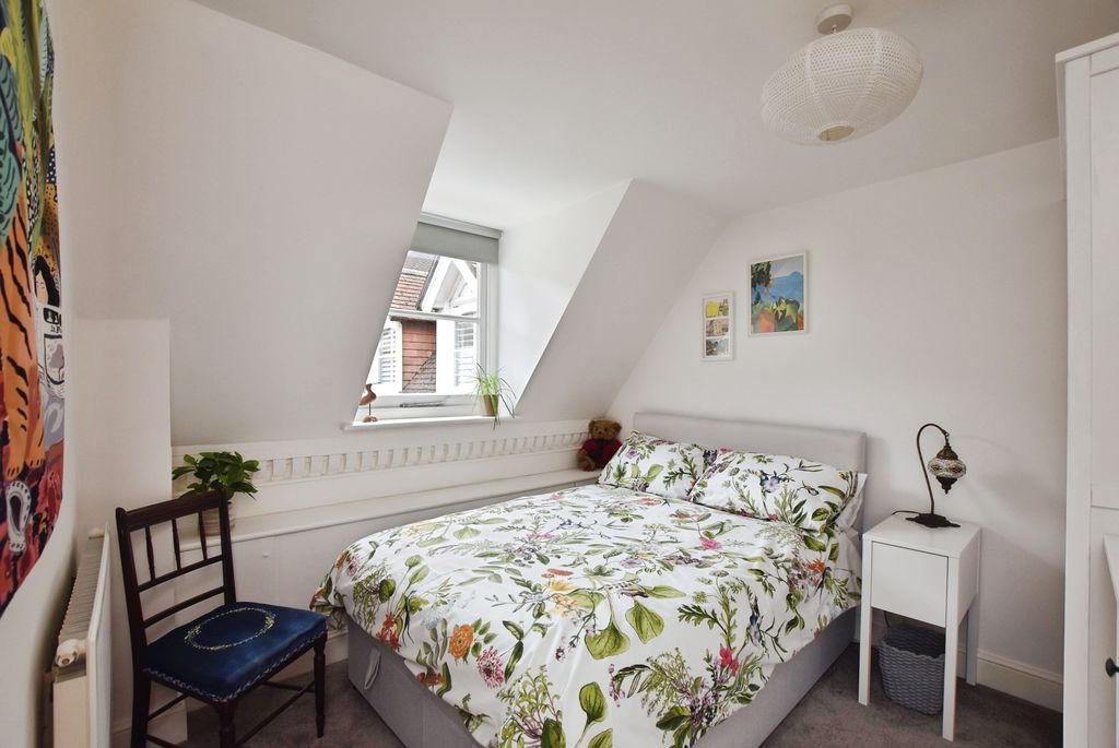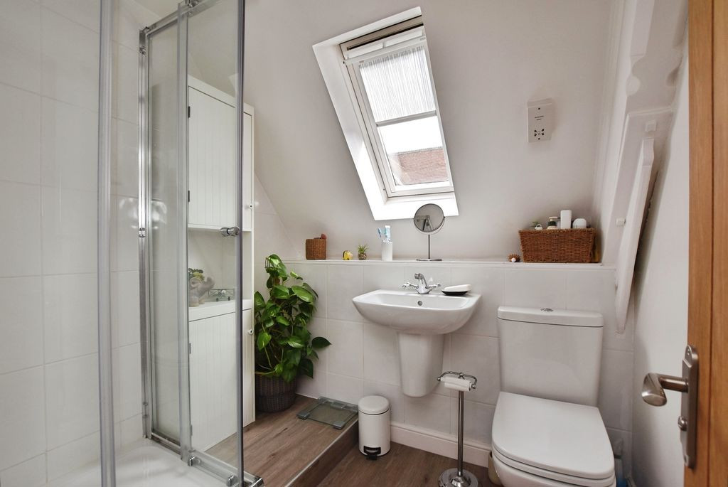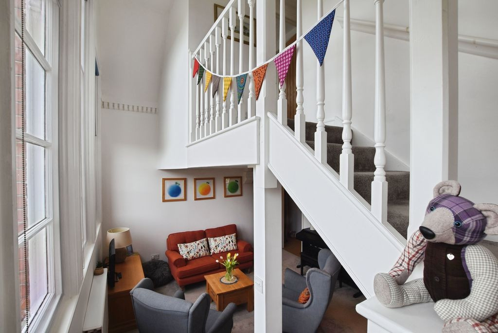 To the first floor, a landing leads to two well-proportioned double bedrooms, each benefitting from character features that reflect the building’s heritage. The accommodation is served by a modern shower room, finished with contemporary fittings including a glass-enclosed shower, WC, and wash hand basin, with a Velux window allowing for natural light and ventilation.