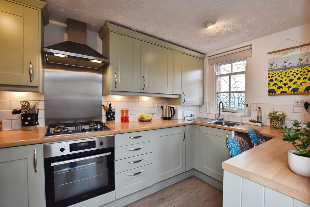 The kitchen is well designed and fitted with a comprehensive range of wall and base units, complemented by integrated appliances including an oven, gas hob with extractor over, and a full-height fridge/freezer. A breakfast bar provides an informal dining option, enhancing both the functionality and sociable nature of the space.