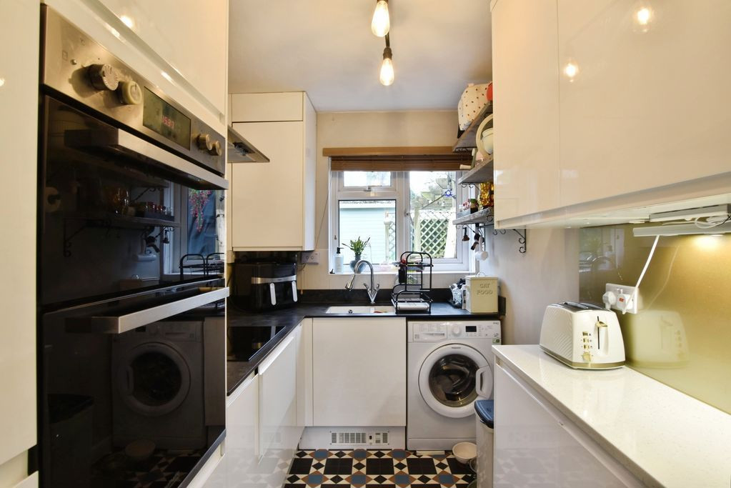 The accommodation is entered via a small entrance lobby, which provides access to both the kitchen and the principal reception room. The kitchen is positioned to the rear of the property and is fitted with a modern range of wall and base units, incorporating a sink unit with storage below, together with space and plumbing for a washing machine and space for a fridge. A rear-facing double-glazed window provides good natural light.