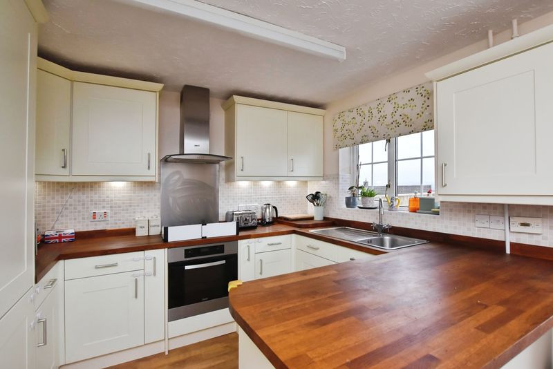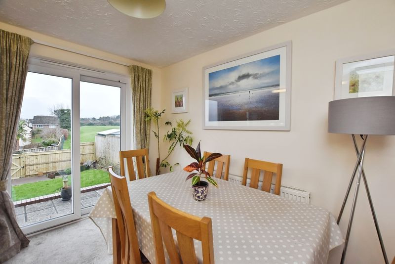 To the rear, the kitchen and dining room has been thoughtfully re-fitted to a contemporary standard and forms the heart of the home. The kitchen is well equipped with a comprehensive range of wall and base units, integrated appliances and concealed boiler, while the dining area provides ample space for a family table. Patio doors open directly onto the rear garden, allowing natural light to flood the space and creating a strong connection between indoor and outdoor living, with attractive open views beyond.