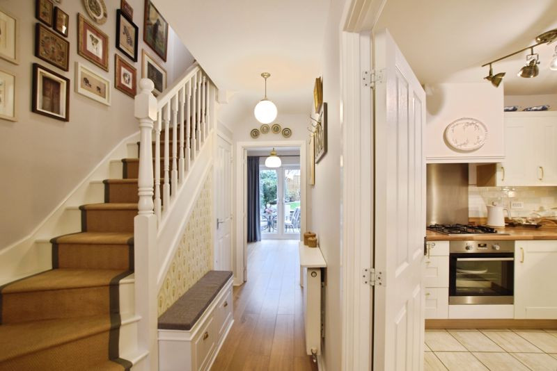 A welcoming entrance hall sets the tone, with stairs rising to the upper floors and access to a contemporary cloakroom. To the right, the kitchen is presented in a clean, neutral palette and fitted with matching wall and base cabinets, tiled splashbacks, integrated oven with gas hob and extractor, and built in appliances and a stunning ceramic sink. Tiled flooring completes the modern feel. There is ample space for a dining table and chairs. To the rear, the generous sitting room offers an inviting and versatile living space. A large window and double patio doors draw in plentiful natural light and open directly onto the garden, creating a seamless transition for everyday living and entertaining. A useful under-stairs storage cupboard completes the ground floor.