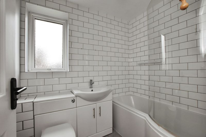 To the first floor, the property offers three well-proportioned bedrooms. The principal bedroom is a comfortable double room overlooking the rear garden, while the second bedroom is also a generous double, benefitting from built-in wardrobes and dual front-facing windows. The third bedroom is a well-sized single, suitable for use as a child's bedroom, guest room or home office. These rooms are served by a neatly presented family bathroom, fitted with a modern suite including a bath with shower over, vanity wash hand basin, WC and heated towel rail, all complemented by contemporary tiling.