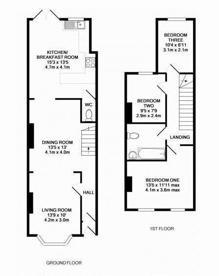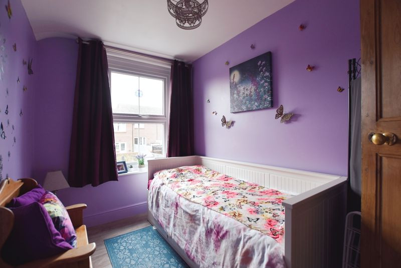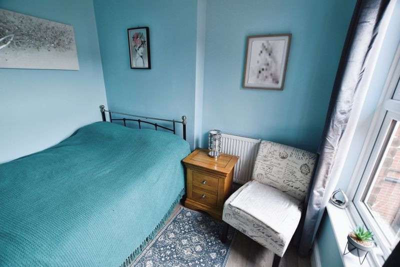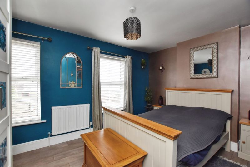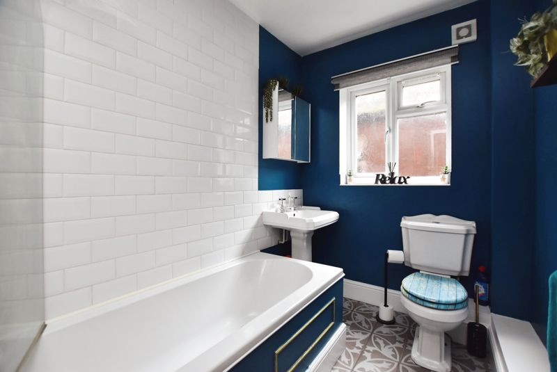 Upstairs, the landing leads to three well-proportioned bedrooms and a charming bathroom. The principal bedroom, with two front-facing windows, is bright and spacious, while the second and third bedrooms overlook the rear garden, offering versatility as guest rooms or a home office. The bathroom is finished to a high standard, featuring a panelled bath with a rain shower, a glass screen, a pedestal sink, and a WC. Feature tiled flooring, tiled splashbacks, and an obscured side window complete the look.