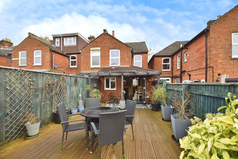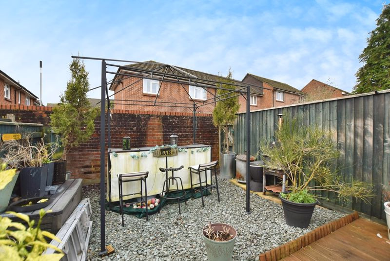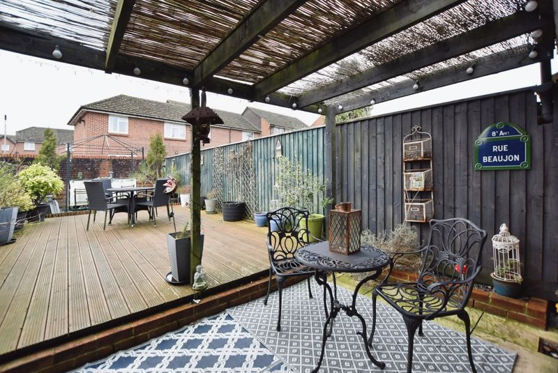 The rear garden is a private, low-maintenance oasis. A tiled patio leads to a large decked area, perfect for outdoor dining, with a slate-finished section at the back for additional seating. The garden is fully enclosed with secure side access.