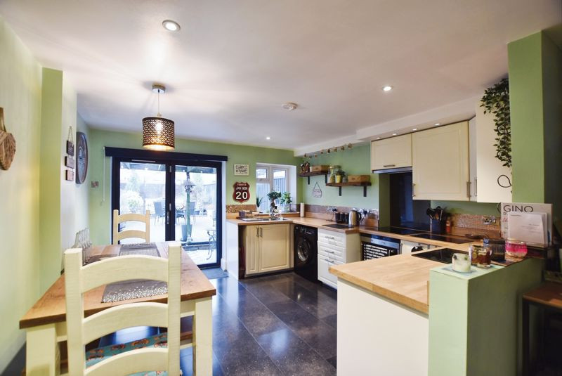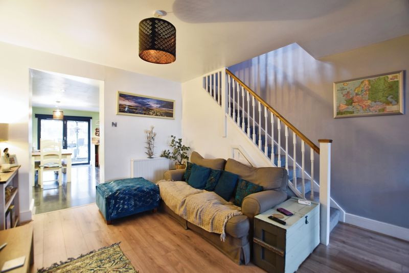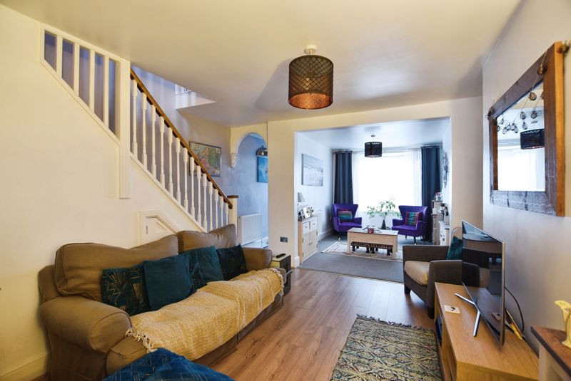 Inside, the entrance hall impresses with its tiled flooring and seamless flow into the main living spaces. The dining area, warmed by a double radiator, connects effortlessly to the modern kitchen through an open archway. Under-stairs storage and stairs to the first floor add practicality, while the adjoining living room enjoys a bright bay window, creating a stylish and comfortable space for relaxing or entertaining.