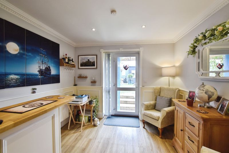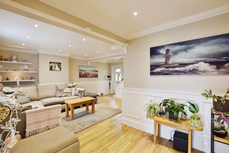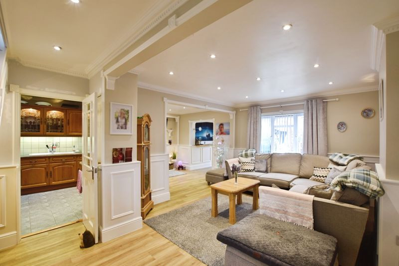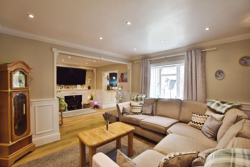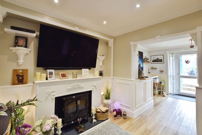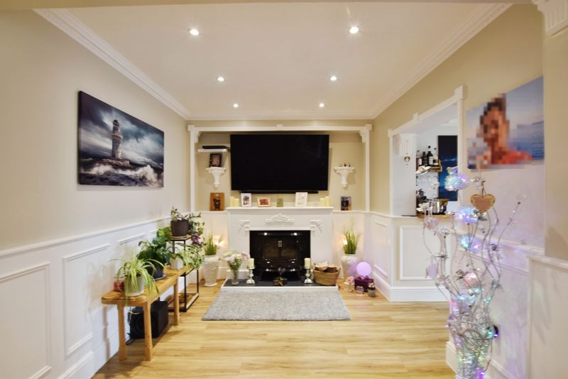 Upon arrival, the property benefits from a low-maintenance concrete driveway offering off-road parking. A smart front entrance leads directly into a superb open-plan living area, a bright and welcoming space with dual aspect windows to the front and rear. Stylishly finished with panelled walls and neutral tones, the room is cleverly zoned into multiple seating areas, including one centred around a charming feature fireplace, and another more secluded lounge area with direct access to the garden, ideal for entertaining or relaxing.