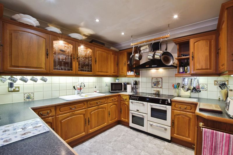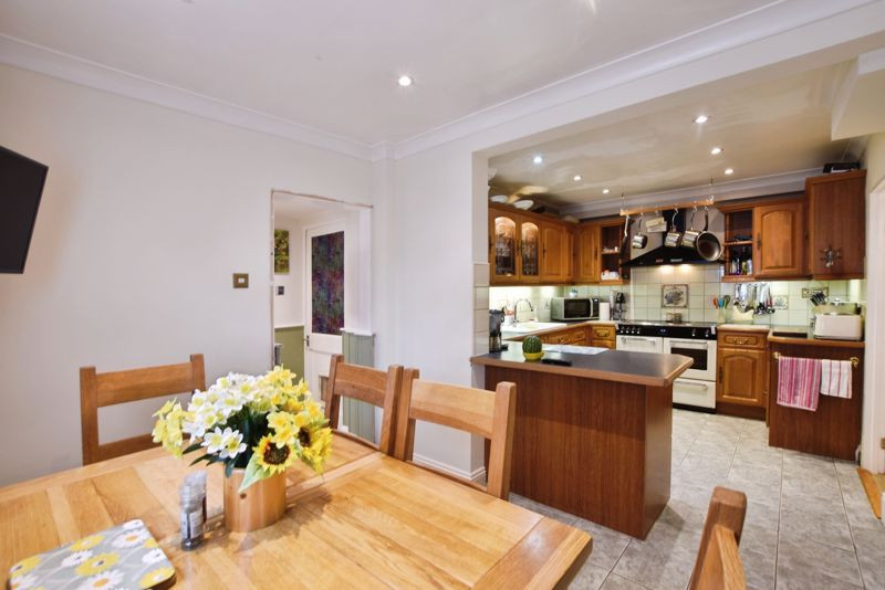 The kitchen/dining room continues the home's open and inviting feel. This well-appointed room includes a wide range of matching wall and base units with coordinating worktops and ample space for freestanding appliances. The square-shaped layout is practical and sociable, with the dining area easily accommodating a full-size table and chairs. A door from the kitchen leads to the cloakroom, which has been recently updated with a modern WC and hand wash basin. Beyond this is a separate utility room housing the Worcester- Bosch boiler, with space and plumbing for a washing machine and tumble dryer, as well as extensive shelving for additional storage.