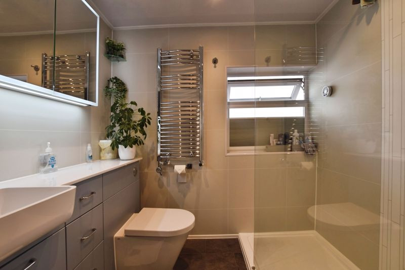 Upstairs, the first floor offers four comfortable double bedrooms, all immaculately decorated. The principal bedroom is a generous double overlooking the rear garden and features two built-in wardrobes. Bedroom two, also a spacious double, includes a built-in wardrobe and a rear-facing window. Bedroom three is another double with a window to the front aspect. Bedroom four, located at the front of the property, is currently used as a double bedroom but could also serve well as a study or guest room. The newly fitted family shower room is sleek and contemporary, with a large walk-in double shower enclosure, built-in WC and hand basin with vanity storage, LED mirrored cabinet, and a modern ladder-style towel radiator.
