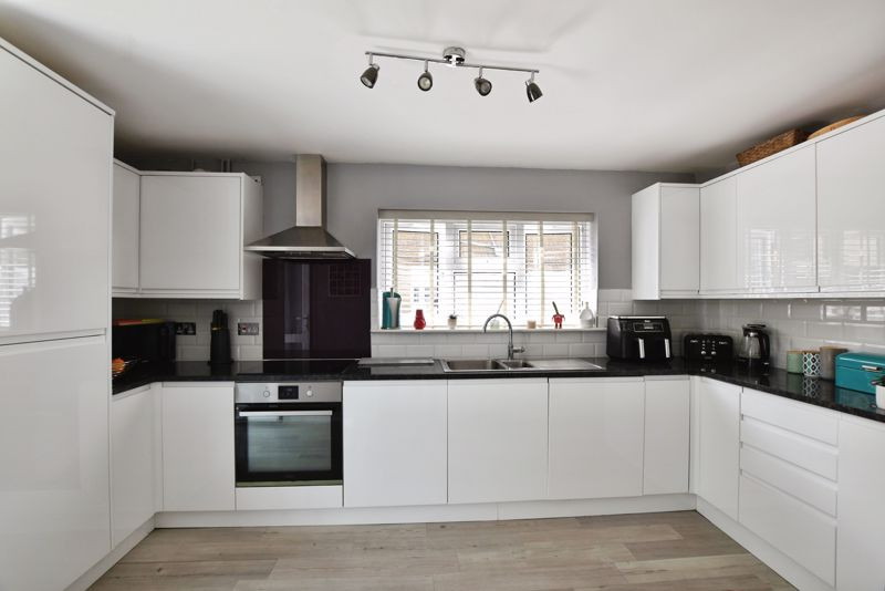 The open plan living and dining area is a versatile and inviting space, ideal for both relaxing and entertaining. A large window to the front aspect fills the room with natural light, while a stylish feature fireplace adds warmth and character. The dining area provides ample space for a table and chairs and benefits from glazed double doors that lead into the conservatory, enhancing the flow of natural light and offering lovely garden views. The conservatory has under floor heating, spacious and fully glazed with a glass roof, tiled flooring, and panoramic views over the garden. It functions beautifully as a sunroom or additional sitting space and enjoys direct access to the patio and garden.