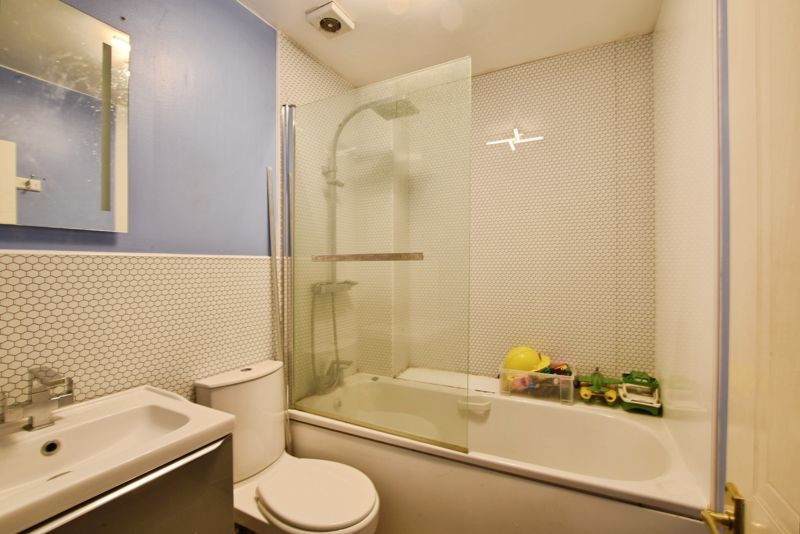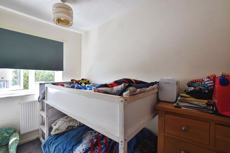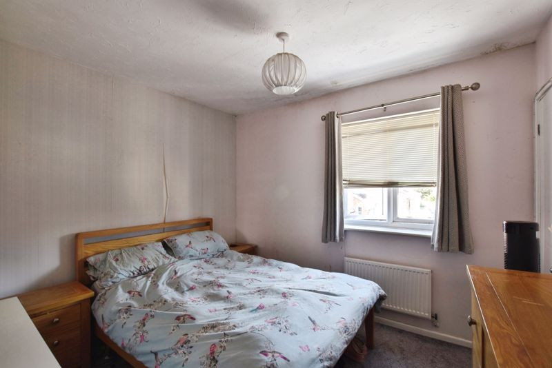 Upstairs, the property offers three bedrooms. The main bedroom is located at the front, with a window overlooking the front aspect. Two further single bedrooms are positioned at the rear, with views over the garden. The family bathroom includes a bath with wall-mounted shower, WC, and wash hand basin.