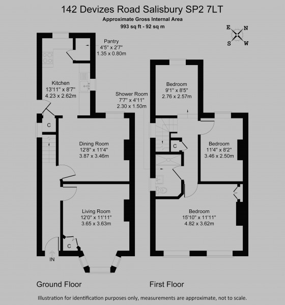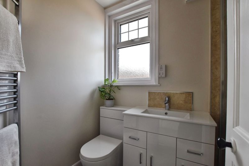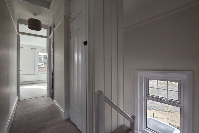 Stairs rise to the first floor, where a window on the landing provides natural light. There are three bedrooms and a modern family shower room. The principal bedroom is a generous double room to the front of the property, benefitting from two windows, a built in cupboard and a feature fireplace. Bedrooms two and three are positioned to the rear and enjoy views over the garden and beyond towards Old Sarum. The shower room is fitted with a contemporary suite comprising a walk-in double shower, WC and wash hand basin set within a vanity unit, complemented by easy-clean splashbacks. An airing cupboard is located on the landing.