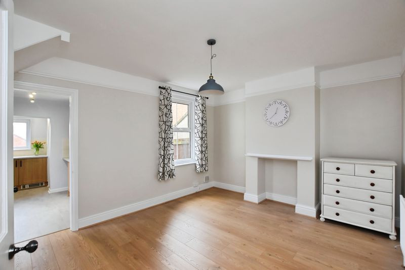 To the rear, the dining room provides a further well-proportioned reception space, with wooden flooring and a window overlooking the garden. This room flows naturally into the kitchen. The kitchen enjoys dual-aspect windows and a door providing direct access to the garden. It is fitted with a range of wall and base units with adjoining work surfaces, an integrated oven and hob, space for additional appliances and a wall-mounted gas boiler. A pantry cupboard and further built-in storage enhance practicality.