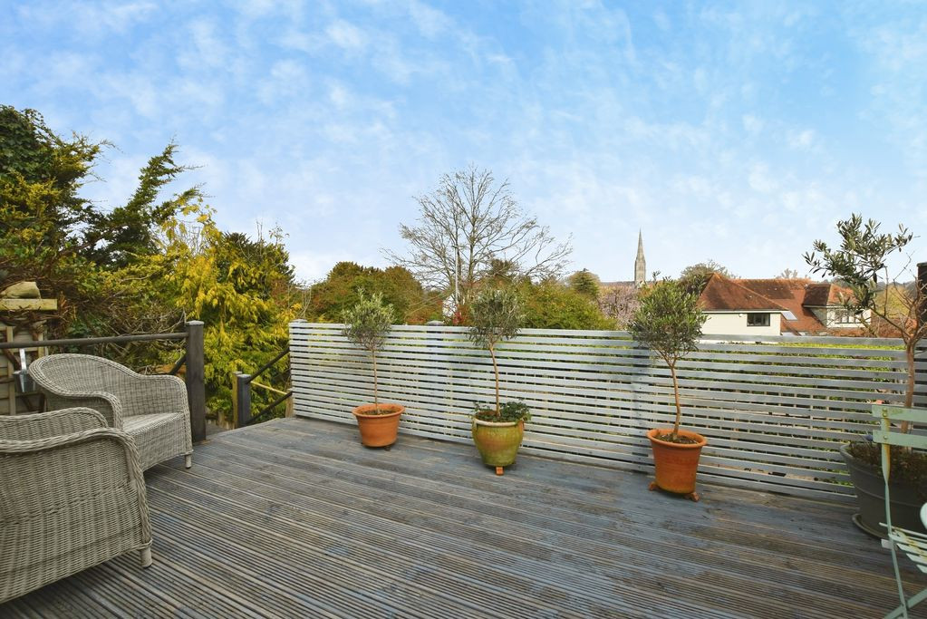 Externally, the property is equally appealing. To the front, a driveway provides off-road parking and access to the integral garage, which benefits from power and lighting and houses the Worcester gas-fired boiler. A small area of garden is laid to lawn with established flower beds. The rear garden has been attractively landscaped and arranged over several terraced levels, creating a series of well-defined outdoor spaces. Immediately adjoining the property is a generous decked terrace, ideally suited to outdoor dining and entertaining, from where there are particularly attractive views across Harnham towards Salisbury Cathedral. Steps descend to further areas of garden featuring established planting, shrubs and a useful storage shed.