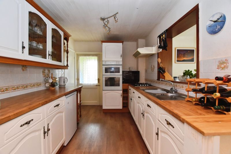 The entrance porch opens into a welcoming sitting room, a light and inviting space with a window to the front aspect and a feature fireplace providing a charming focal point. The semi open-plan kitchen and dining area form the heart of the home, an excellent space for family living and entertaining. The kitchen is fitted with a range of matching wall and base units with wooden worktops, an integrated double oven, gas hob with extractor, and a stainless-steel sink with drainer. The dining area enjoys an abundance of natural light from three full-length windows and double patio doors which open directly onto the rear garden, creating a seamless connection between indoors and out. Beyond the kitchen lies a practical utility room offering further storage, work surfaces, a sink, and space for white goods, with access to both the garden and a cloakroom with WC and hand basin.