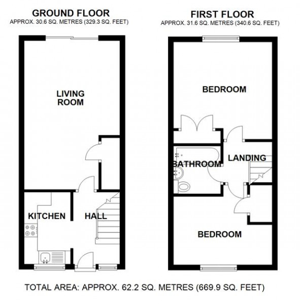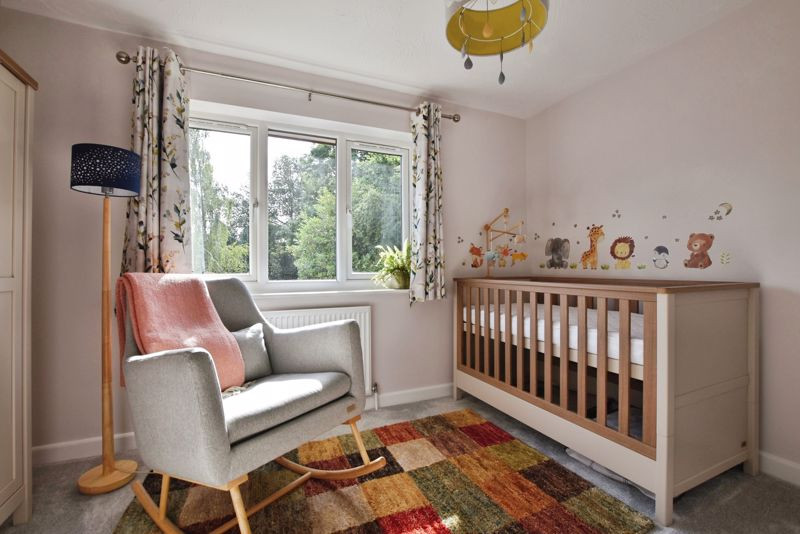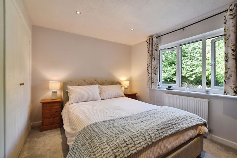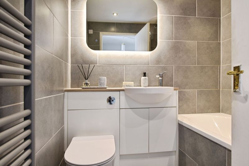 Upstairs, the first-floor landing gives access to two well-proportioned bedrooms and a smart, fully tiled bathroom. Bedroom one, located to the front, is a spacious double with a built-in wardrobe, while bedroom two to the rear also features fitted storage and a view over the garden. The bathroom has been thoughtfully updated, complete with a bathtub and rainfall shower, additional handheld attachment, concealed cistern WC, wash hand basin with countertop, backlit vanity mirror, and a heated towel rail, all presented in modern, elegant finishes.