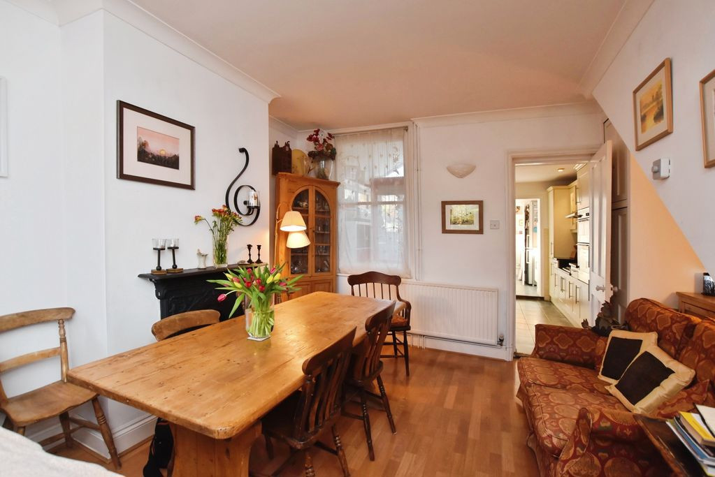 The principal reception space is a superb open-plan sitting and dining room, providing a refined yet versatile environment for both everyday living and entertaining. The room benefits from a dual-aspect arrangement, with large, glazed doors to the front framing views across Wyndham Park, and a rear window ensuring excellent natural light throughout. A feature open fireplace forms an attractive focal point, enhancing the room’s period charm.