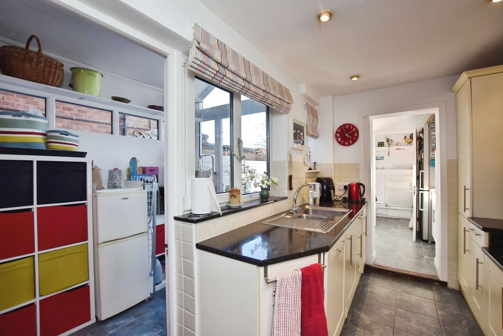 To the rear, the kitchen is arranged in a practical galley style and fitted with a comprehensive range of cabinetry, complemented by quartz work surfaces. Integrated appliances include double ovens and a gas hob with extractor above. The kitchen extends into a useful utility area, offering additional storage, worktop space, and plumbing for appliances, along with a cloakroom comprising WC and wash hand basin. A lean-to provides further ancillary storage, and a door leads out to the rear courtyard.