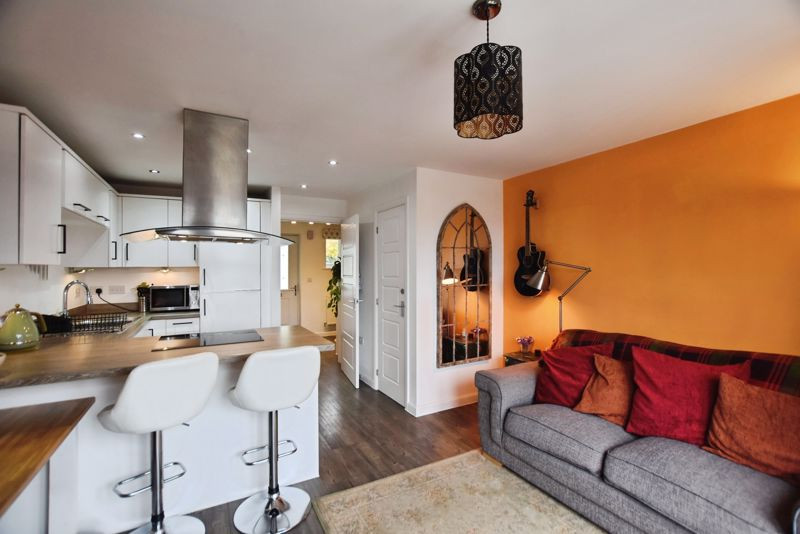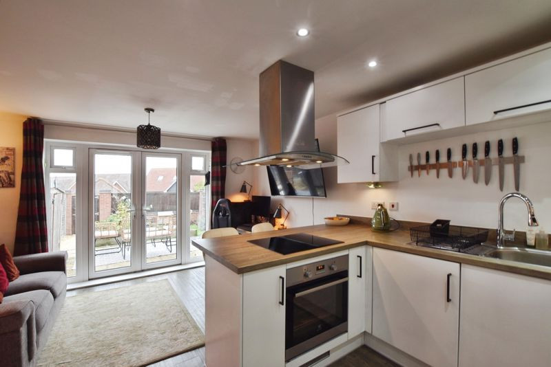 The ground floor features a welcoming entrance hall leading to a convenient cloakroom and a superb open-plan kitchen and living area. The kitchen is fitted with a range of contemporary units and integrated appliances, including an induction hob, built-in oven, fridge/freezer, and washer/dryer. A breakfast bar offers casual dining space, while full-height windows and glazed double doors fill the room with natural light and open directly onto the rear garden, creating an ideal setting for both everyday living and entertaining.