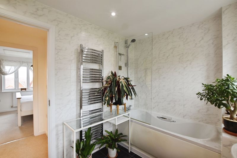 Upstairs, the bedroom is of generous proportions and features two fitted double wardrobes with additional shelving and drawers, offering excellent storage. The bathroom is fully tiled and fitted with a contemporary white suite comprising a panelled bath with overhead shower, pedestal basin, WC, and a heated towel rail. Further features include large storage cupboards both upstairs and beneath the stairs, fitted wardrobes, and gas central heating throughout.