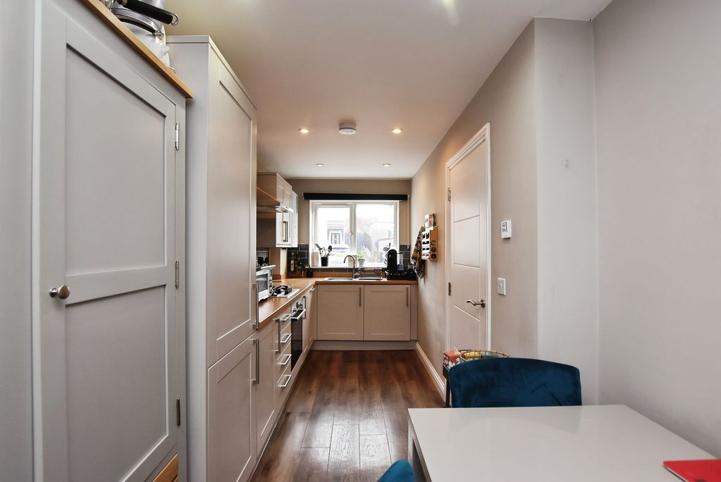 To the front, there is driveway parking alongside a single attached garage, which also provides convenient access through to the rear garden. Internally, a spacious and welcoming entrance hall provides access to the principal ground floor accommodation, including the kitchen, sitting room and a cloakroom. The hallway also offers useful additional space beneath the stairs, ideal for storage or a discreet home working area.
