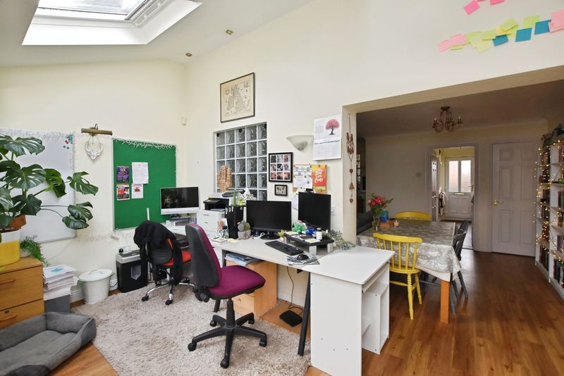 The sitting room is generously proportioned and features a fireplace as a focal point. An opening to the rear leads into the impressive extension, with a feature glass brick wall enhancing the sense of light and space. The dining area, currently arranged as a home office, is a particularly attractive addition with its vaulted ceiling, Velux window, rear window and double patio doors opening directly onto the garden, creating an excellent connection between indoor and outdoor living. There is also a versatile additional room currently used as storage, which could readily serve as a home office or snug, benefiting from its own door to the rear garden. A well-appointed cloakroom completes the ground floor.