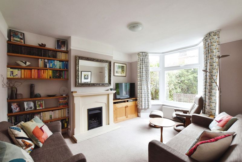Carpeted reception room with window bay to the front aspect. Offers a central chimney breast housing a gas fireplace with surrounding stone hearth, and has adjoining oak shelving.