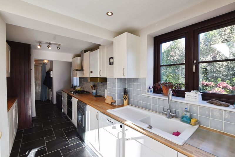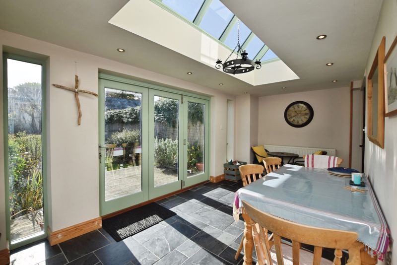 The accommodation is deceptively spacious, offering two generous bedrooms, three reception rooms, and beautifully secluded gardens with a detached single garage and driveway parking. The solid timber front door opens into a welcoming entrance hall providing ample space for coats and access to the principal rooms. The slate tiled flooring continues through to the well-appointed galley kitchen, fitted with a comprehensive range of Shaker-style units, extensive work surfaces, and integrated appliances including a double oven with five-ring gas hob. There is additional space for a dishwasher and a larder-style fridge freezer. The kitchen opens seamlessly into the Orangery, an exceptional space with a vaulted ceiling lantern, creating a wonderful sense of light and volume. Bi-fold doors extend the living space outdoors, making this a superb area for dining and entertaining. The sitting room is a delightful, characterful space featuring an exposed brick fireplace housing a wood-burning stove. The adjoining study offers a generous additional reception room and accommodates the staircase to the first floor.