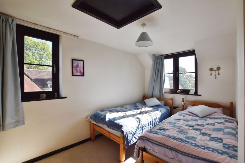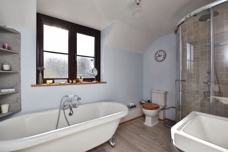 Upstairs, the first-floor landing provides access to two well-proportioned bedrooms, both fitted with wardrobes. Bedroom two enjoys a dual aspect, and both are served by a beautifully appointed bathroom comprising a traditional roll-top bath with claw feet, separate shower enclosure, wash hand basin, WC, and heated towel rail.
