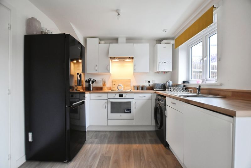 The kitchen/diner is an attractive and functional space, fitted with contemporary white cabinetry, solid oak worktops, and integrated appliances including an electric oven, hob, and extractor fan. There is provision for a full-height fridge freezer, washing machine, and dishwasher, ensuring excellent practicality. French doors open onto the rear terrace, creating a seamless connection between the interior accommodation and the garden, and offering an ideal layout for entertaining.