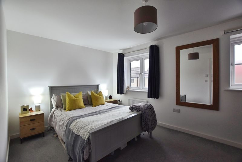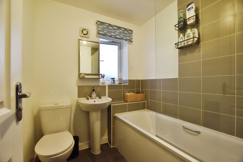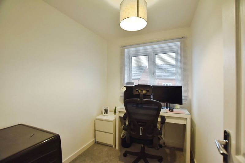 The first floor provides three well-proportioned bedrooms. The principal bedroom is notably spacious, featuring fitted wardrobe space, dual windows to the front elevation. The second bedroom is a comfortable double overlooking the garden, while the third bedroom, currently used as home office, offers flexibility for use as a nursery or child's bedroom. A well-appointed family bathroom with contemporary tiling and a shower over the bath serves all bedrooms.