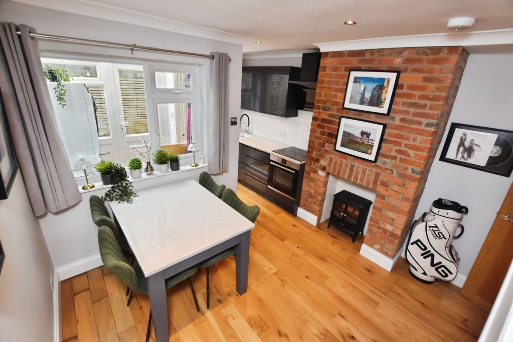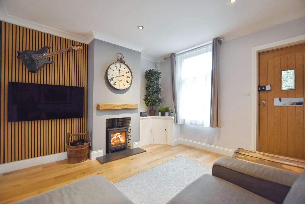 Upon entering the property, the sitting room provides a welcoming reception space with a window to the front aspect, attractive oak flooring, and a striking log-burning stove set as the focal point of the room. A feature slatted wall adds a contemporary design element, while a useful cupboard houses the consumer unit.