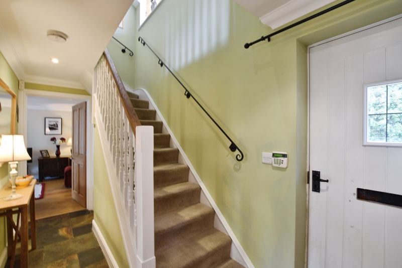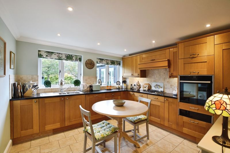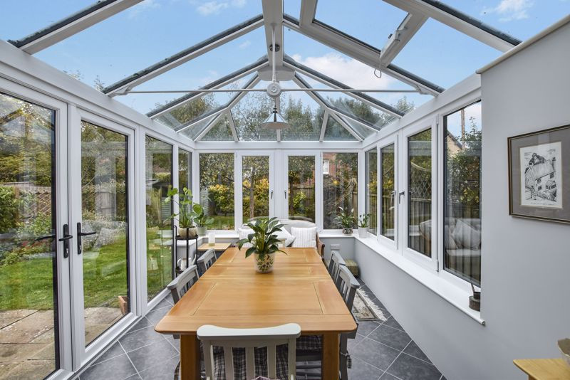 The welcoming entrance hall, with slate flooring and underfloor heating, provides an immediate sense of quality and leads to the principal reception areas. The sitting room is a warm and inviting space, featuring an oak floor, ornamental fireplace with inset coal-effect gas fire, and glazed double doors opening into the conservatory. This bright and airy extension enjoys tiled flooring with underfloor heating and French doors leading onto the rear garden, creating an ideal space for year-round enjoyment.