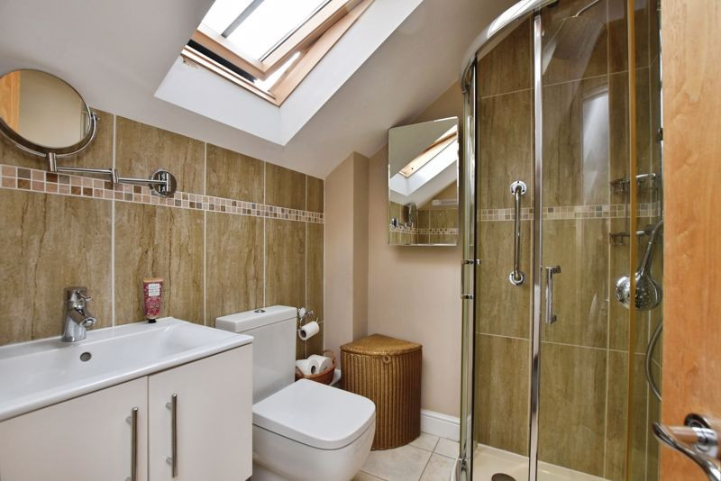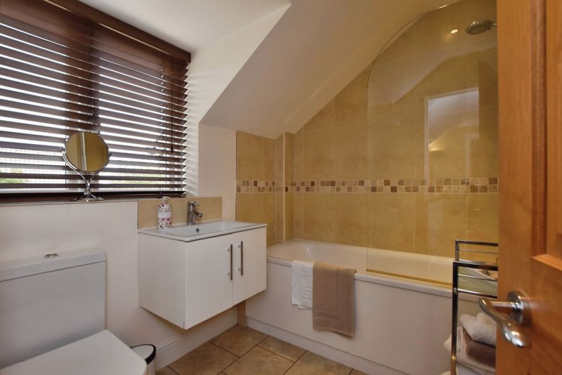 Upstairs, the landing leads to three well-proportioned bedrooms. The principal bedroom benefits from built-in wardrobes and a smart en suite shower room with a tiled cubicle, WC, and hand basin with vanity storage beneath. The remaining two bedrooms are served by a stylish family bathroom featuring a panelled bath with thermostatic shower over, WC, and wash basin, complemented by tiled flooring and walls.