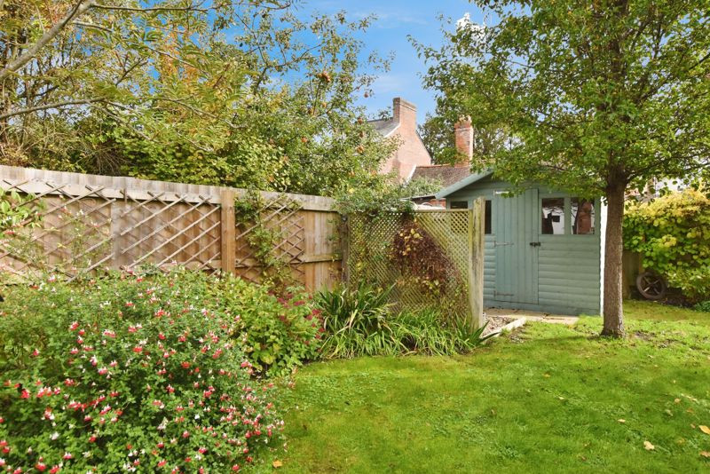 Outside, the property is approached via a shared driveway leading to gravelled parking for two vehicles. The rear garden enjoys a desirable southerly aspect and has been thoughtfully landscaped, featuring a paved terrace ideal for outdoor dining, a well-kept lawn bordered by established shrubs and trees, and enclosed timber fencing providing privacy. There is side access, exterior lighting, and a water tap for convenience.