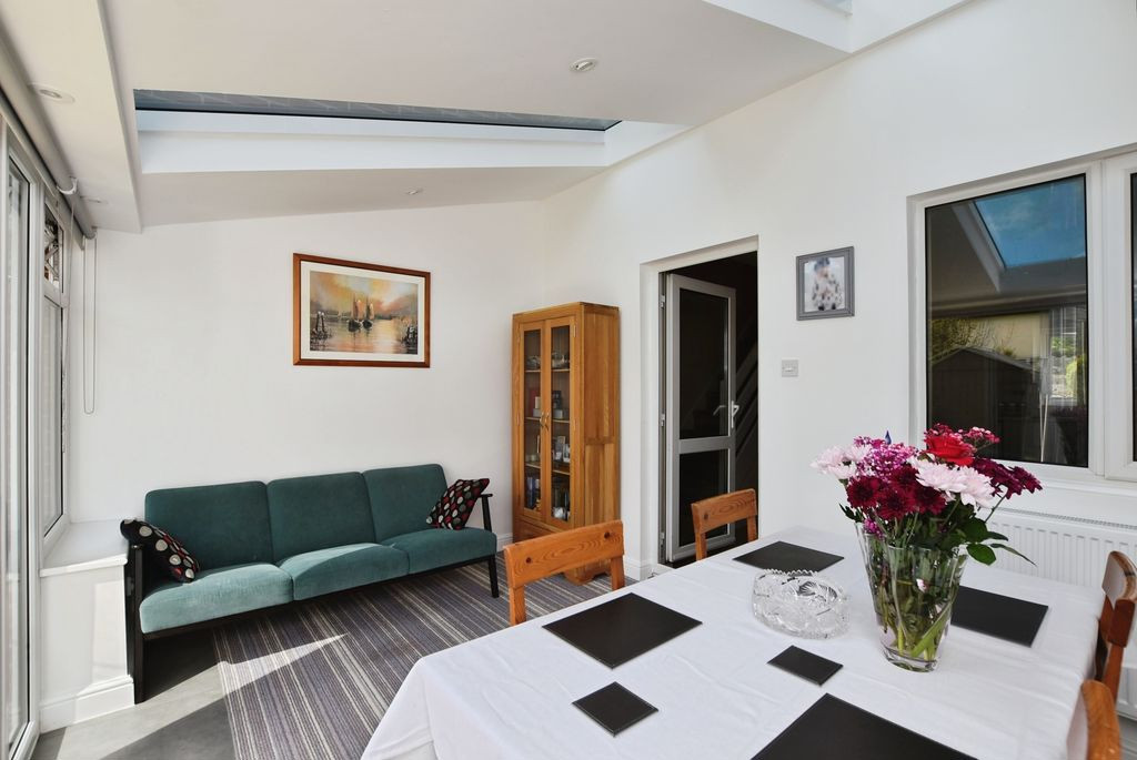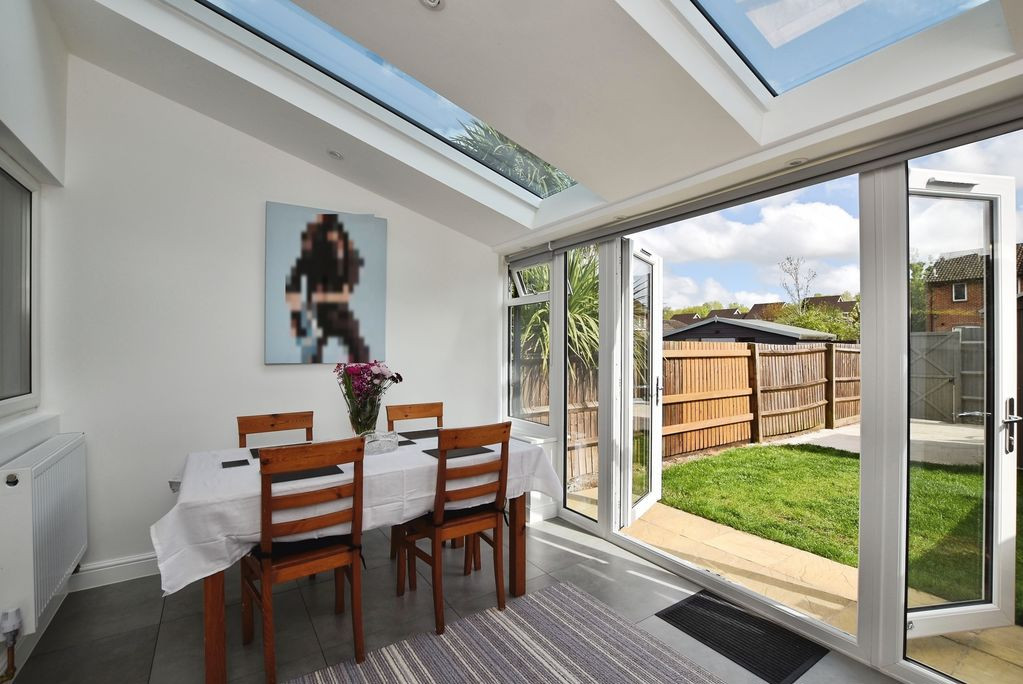 To the rear, the accommodation opens into a comfortable sitting room, which flows seamlessly into an extended dining area. This additional reception space is a notable feature of the home, designed to maximise natural light through the inclusion of glazed patio doors and roof glazing, creating a bright and versatile environment suitable for both everyday living and entertaining. The dining area provides direct access onto the rear garden, enhancing the connection between indoor and outdoor spaces.