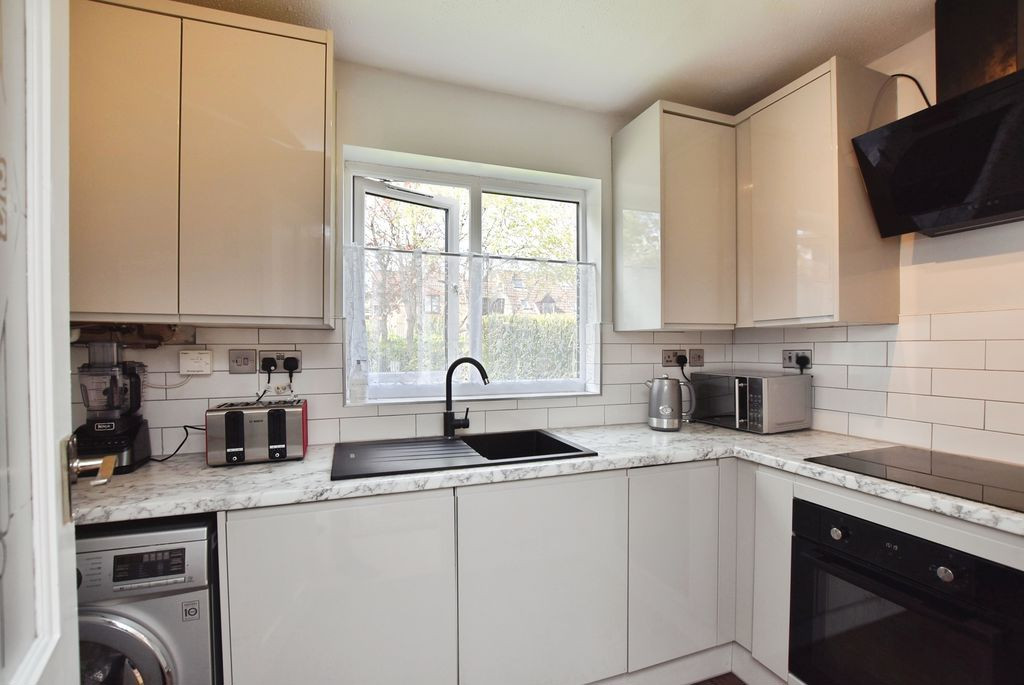 The property is approached via a neatly maintained frontage and entered into a welcoming entrance hall, providing space for coats and footwear, together with a useful understairs storage cupboard. Positioned to the front of the house, the kitchen has been recently refitted and is presented in a contemporary style, comprising a range of sleek, neutral wall and base units with complementary work surfaces. Integrated appliances include a full size dishwasher, an oven and electric hob with extractor above, alongside a composite sink, with additional space provided for further white goods. A front aspect window ensures good natural light.