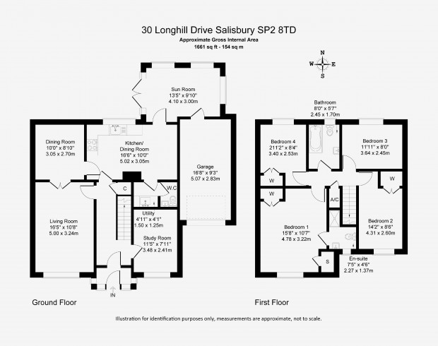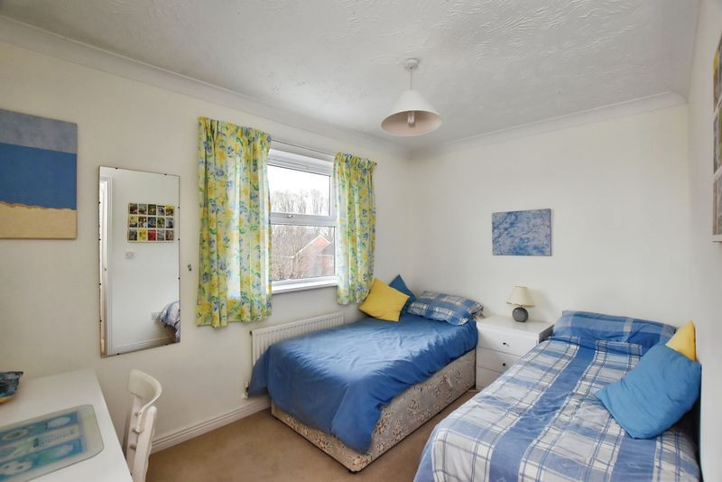 The first floor is arranged around a central landing with loft access. The principal bedroom is positioned to the front of the house and includes built-in storage as well as an en-suite shower room. The second bedroom, also front-facing, features a built-in cupboard. Bedrooms three and four enjoy views across the rear garden and towards Salisbury. The family bathroom comprises a panelled bath with shower over, pedestal basin and WC.