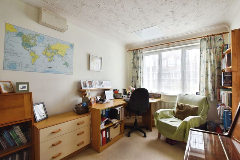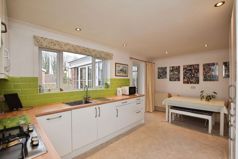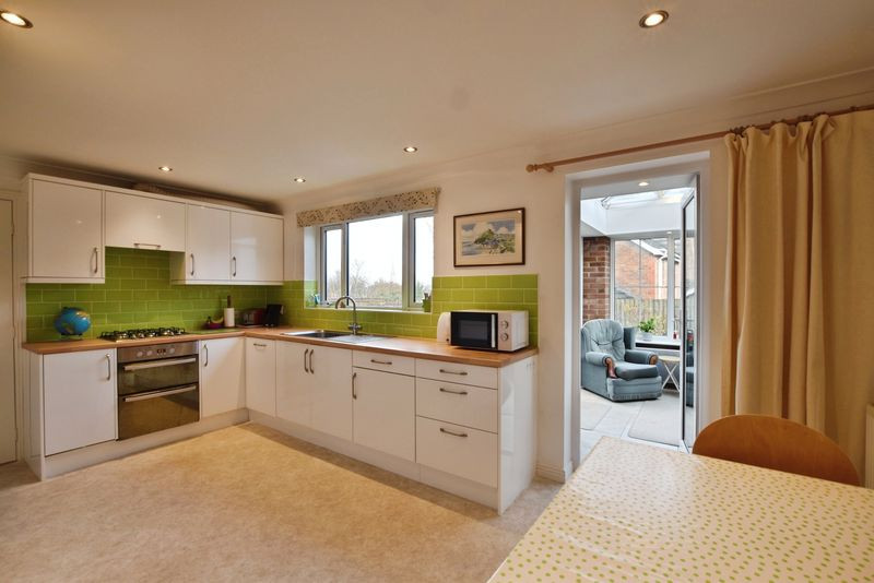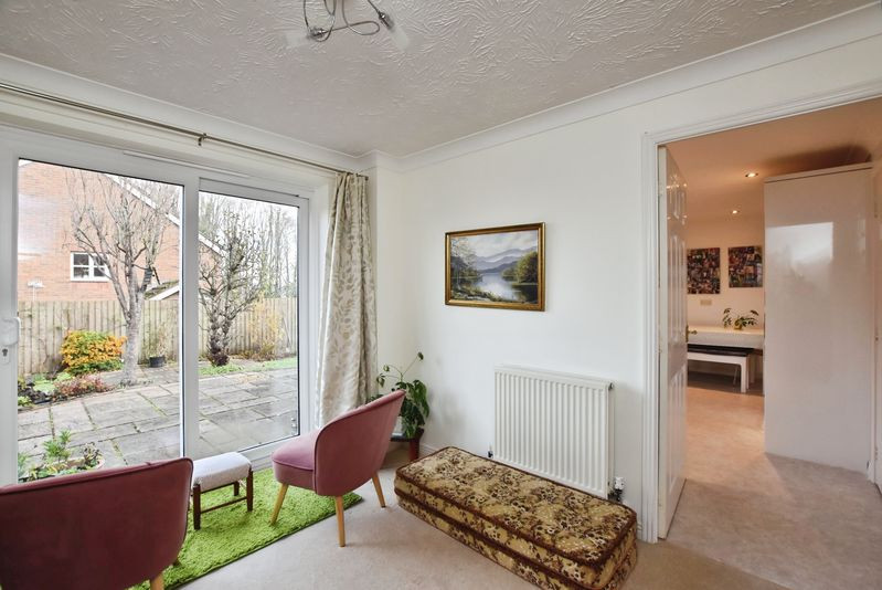 Upon entering, a glazed porch leads into a welcoming reception hall from which the principal ground floor rooms are accessed. To the front of the house is a generous study, ideal for home working. The main sitting room is a bright and well-proportioned space featuring a leaded-light window to the front elevation, and double doors opening into the adjoining dining room. This creates a pleasing flow between the principal reception areas, making the space particularly suitable for both everyday living and entertaining. The dining room enjoys direct access to the rear garden via sliding glazed doors.