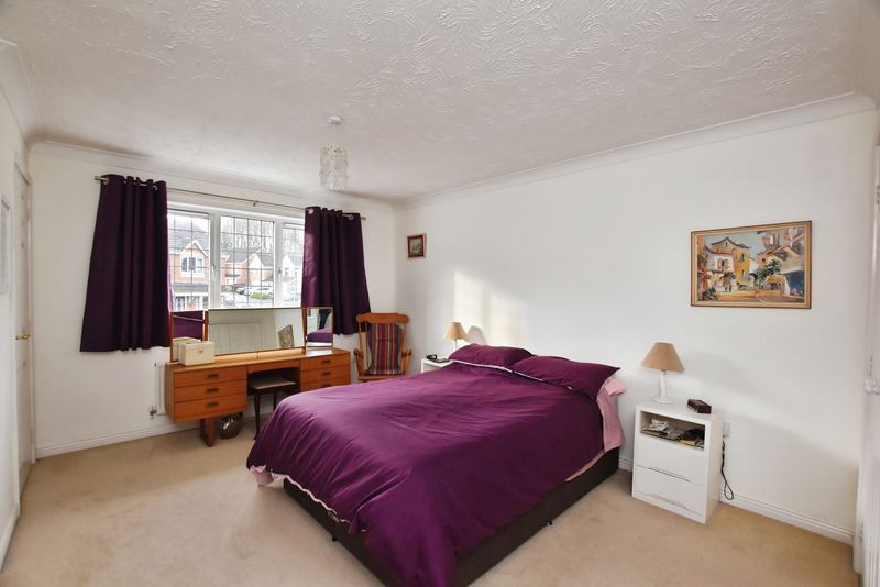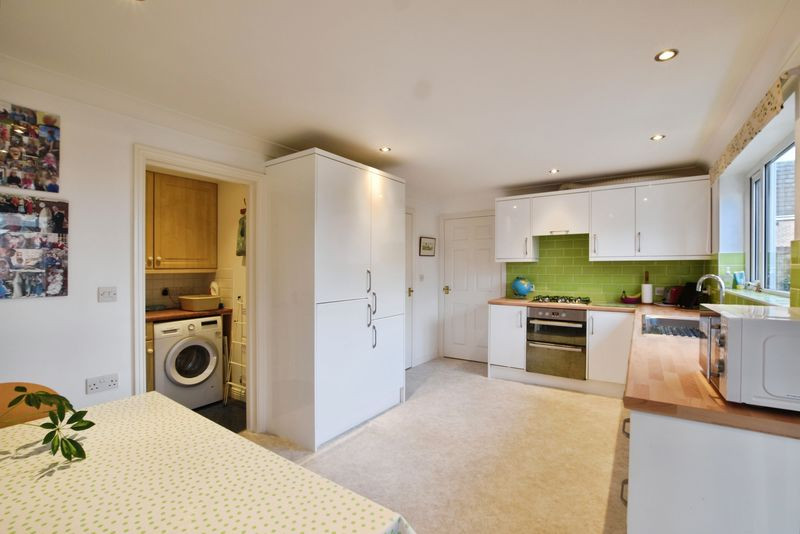 The kitchen/breakfast room is fitted with a range of wall and base units with worktops, a stainless-steel sink with mixer tap, integrated oven, gas hob, and fridge-freezer. A large window provides an outlook over the rear garden. From the kitchen, a door leads into a useful utility room with additional storage, sink and plumbing for laundry appliances. A cloakroom is positioned beyond. Completing the ground floor is the sun room, of half-brick and double-glazed construction, offering an additional reception area with direct access to the garden and an internal door linking into the integral garage, which benefits from power and lighting.