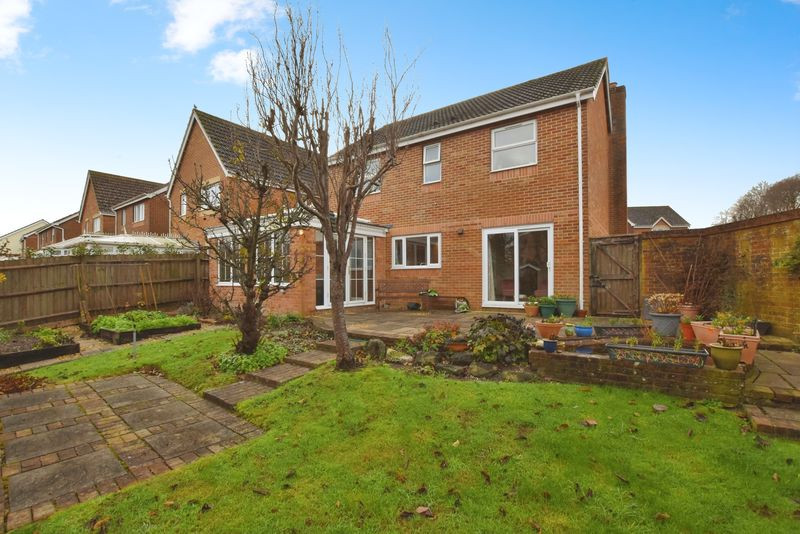 The property is approached via a private driveway leading to the garage, with mature planting framing the front elevation. The rear garden is a particular feature, enclosed by brick walling and panel fencing. A generous sun terrace provides an ideal area for outdoor dining and entertaining, with pathways leading through areas of lawn, established borders, an ornamental pond and productive vegetable and fruit raised beds. The elevated position affords attractive, far-reaching views across Salisbury, including the Cathedral spire. Gated access is provided to the side of the property.